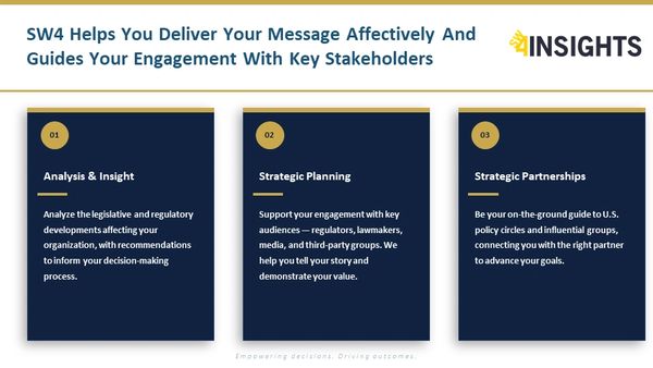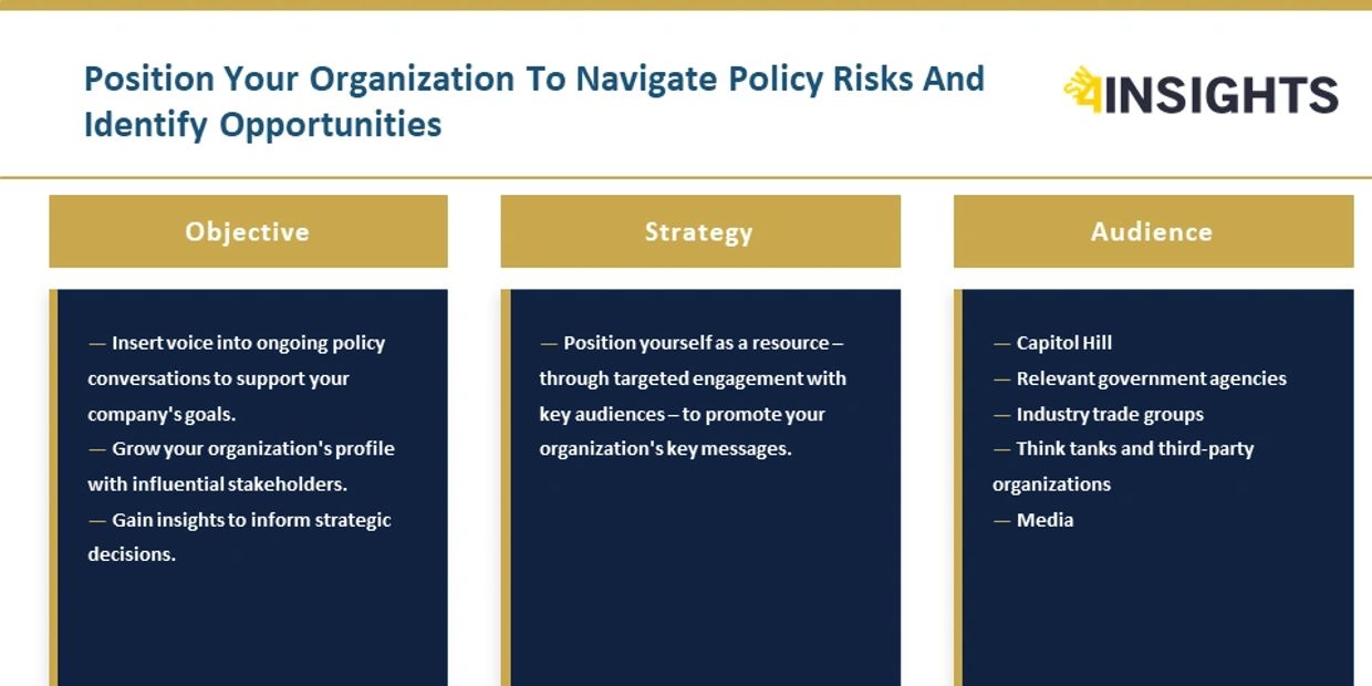 We develop an in-depth understanding of the public policy issues facing your organization to anticipate risks and identify opportunities - ensuring you are well-informed and prepared. We leverage our network, enhanced by comprehensive intelligence gathering, to effectively guide your engagement in Washington D.C.